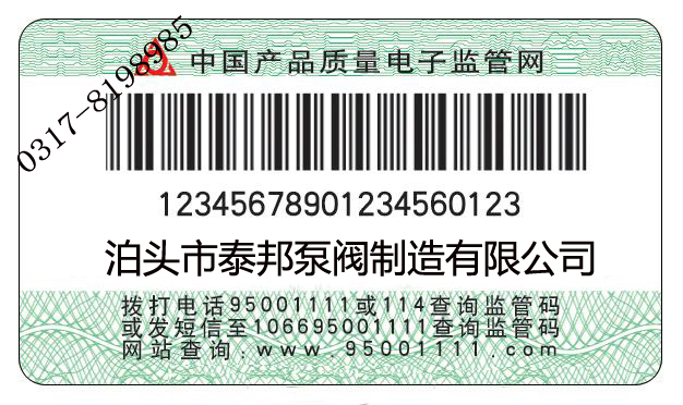 泊頭市泰邦泵閥制造有限公司自2006年12月1 日出廠的產(chǎn)品,在產(chǎn)品合格證上粘貼長方圓形監(jiān)管碼標(biāo)簽,上有20位數(shù)字,這就是產(chǎn)品監(jiān)管碼。因此,我公司生產(chǎn)的每件產(chǎn)品都將有一個“電子身份證”??梢岳霉潭娫?、手機短信、互聯(lián)網(wǎng)、超市終端等網(wǎng)絡(luò)通訊設(shè)備對電子監(jiān)管碼進(jìn)行查詢,辨別真?zhèn)巍2樵冝k法如下: 1. 電話查詢: